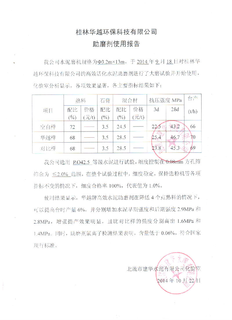北流建華水泥有限公司成功使用助磨劑案例